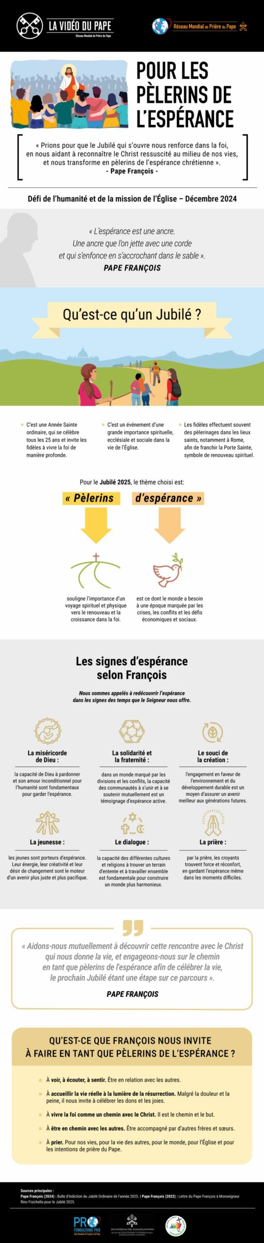 Spes non confundit, l’espérance ne déçoit pas, est le titre de la Bulle d’indiction du Jubilé ordinaire, dévoilée aux Églises des cinq continents lors des deuxièmes vêpres de la solennité de l’Ascension le 9 mai 2024. La bulle, divisée en 25 points, contient des supplications, des propositions, des appels pour les prisonniers, les malades, les personnes âgées, les pauvres, les jeunes, et annonce les nouveautés d’une Année Sainte qui aura pour thème «Pèlerins de l’espérance».